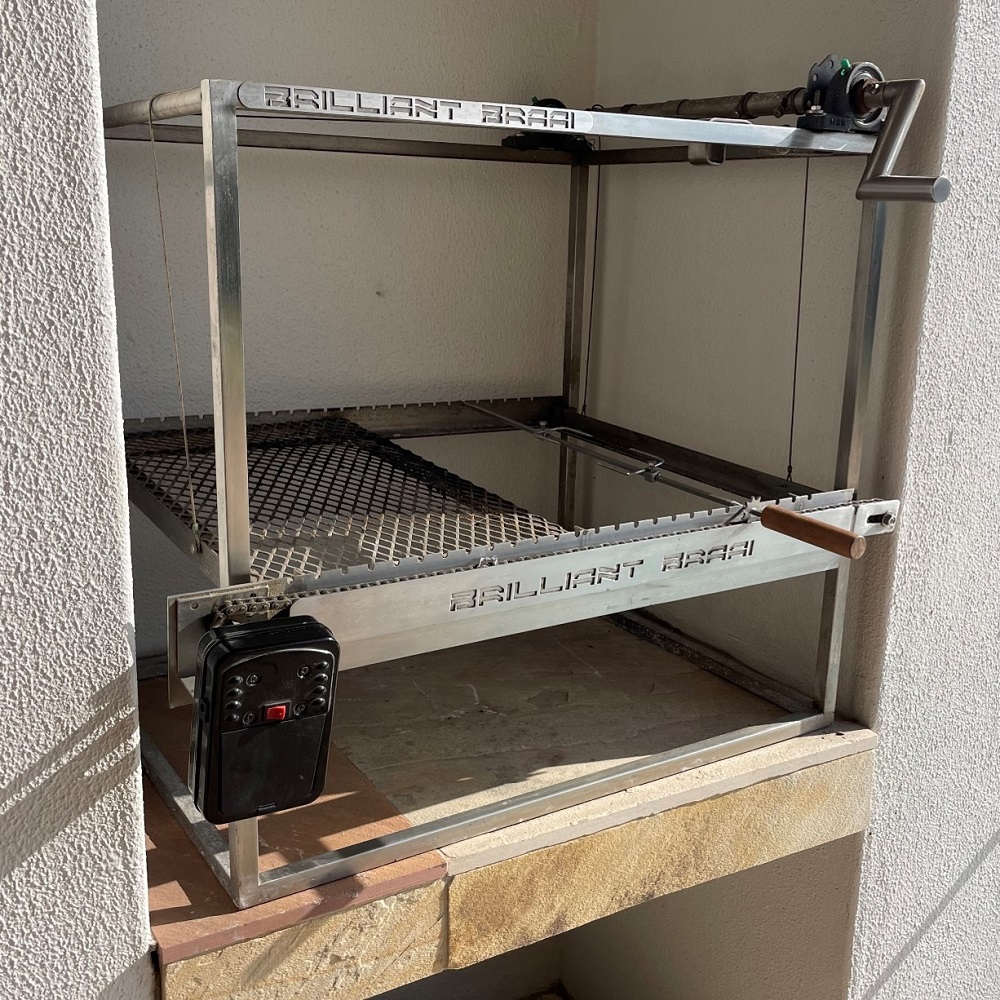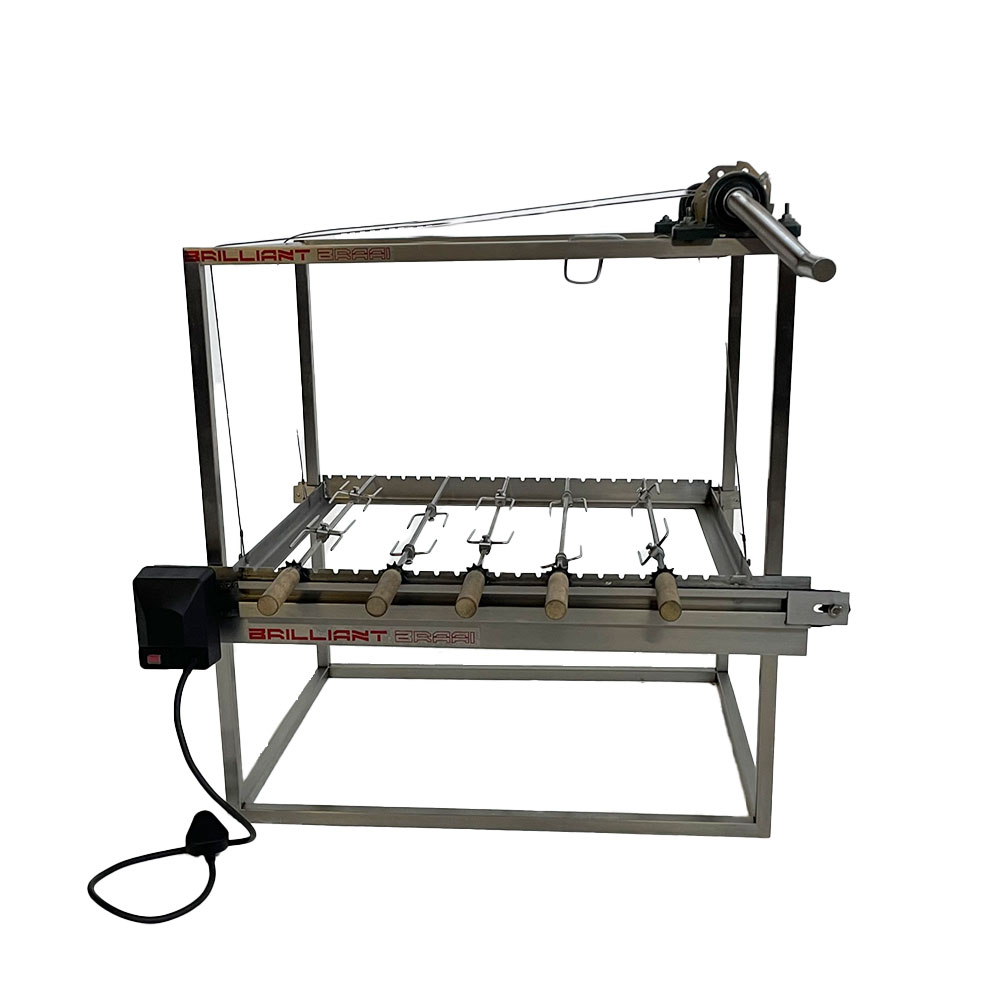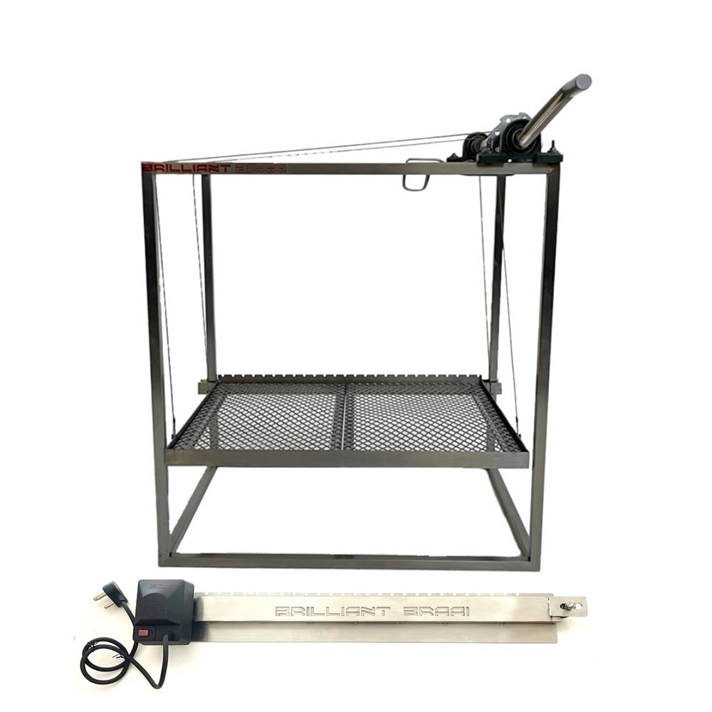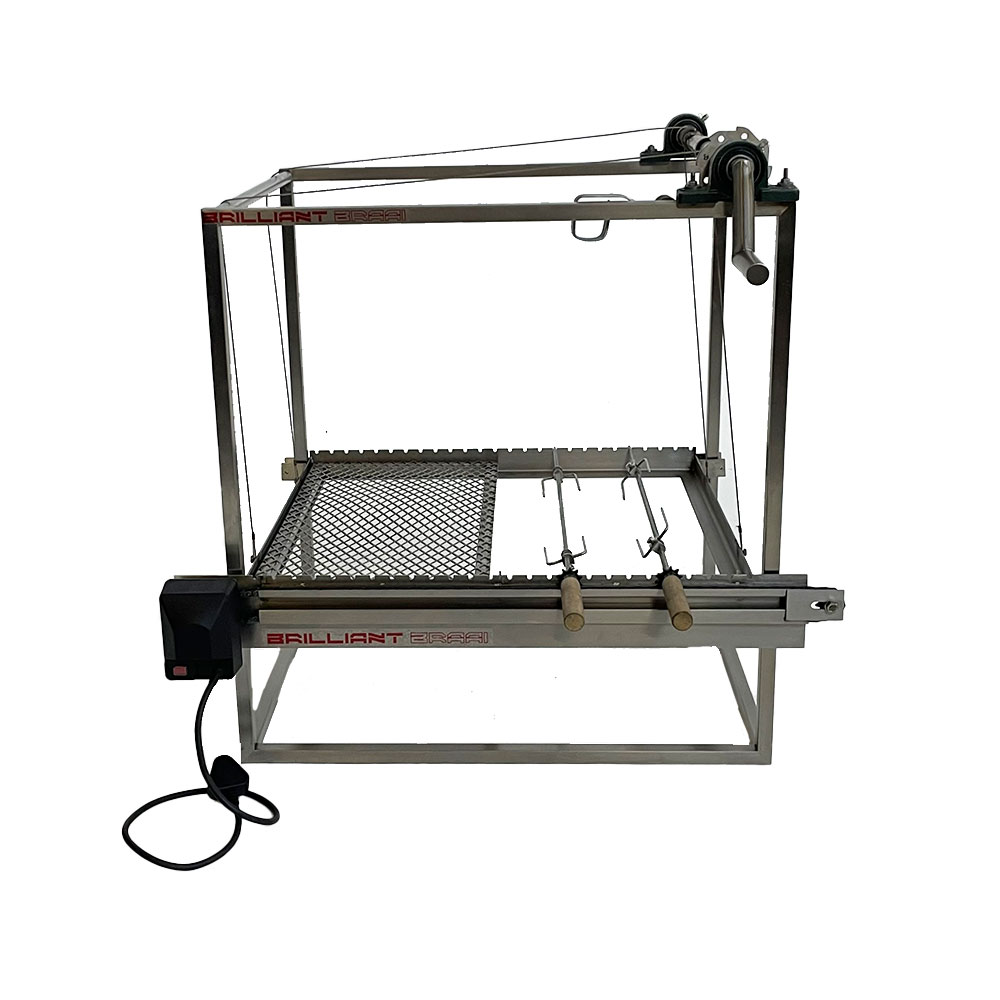 The Full Monty Braai Stand consists of a four poster frame made from 20×20 stainless steel with two grids, the hoist system and the clip on automated rotisserie with 5 skewers. The hoist system easily raises and lowers the grid eliminating the need to wait for the coals to start cooking. The rotisserie can cook a variety of meat and vegetables at the same time, perfect for feeding a crowd. There is even enough space to cook food on the rotisserie and the grid at the same time.